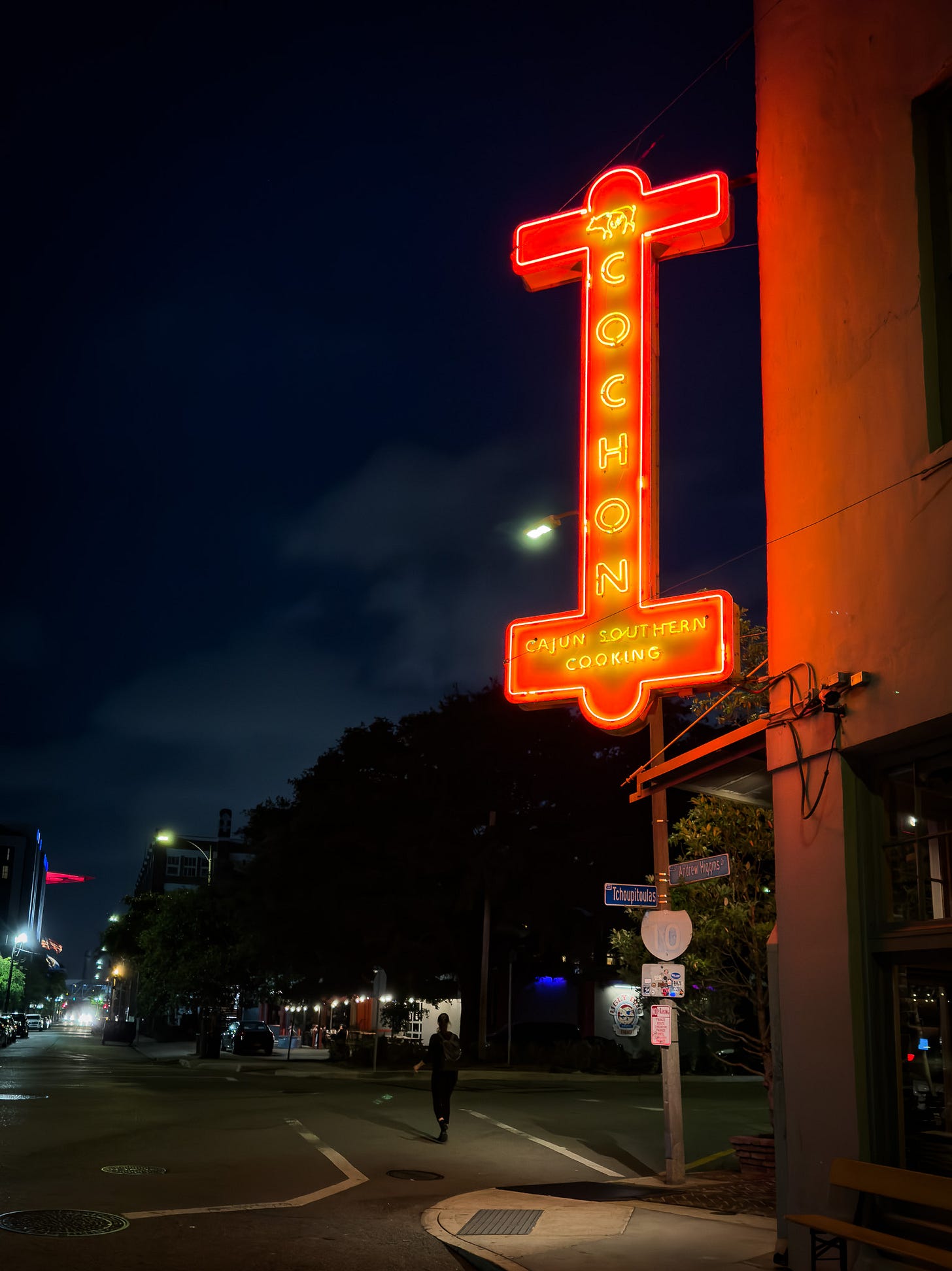 This time, I walked out to the street to take a picture… because what I wanted at that moment was to remember it exactly as it was. Free of the overhang of the visits before. Unthinking about what might someday change or be different. Just that one moment. That Tuesday night in April 2023 on a last-minute trip with my son. Eating there together. The cochon and rabbit stew and pineapple upside down cake. Him, fifteen years old. The two of us just adding to the long, running Kerouac of our travels together.