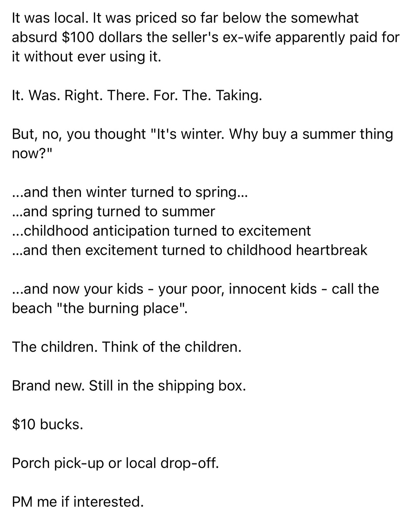 Out town had an active Facebook group for parents and I was on it. People frequently posted stuff for sale. I hadn’t. I was just a known commenter. So, it felt to me like suddenly selling things for $5 and $10 dollars might look like exactly what it was: desperation driven by severe financial problems.