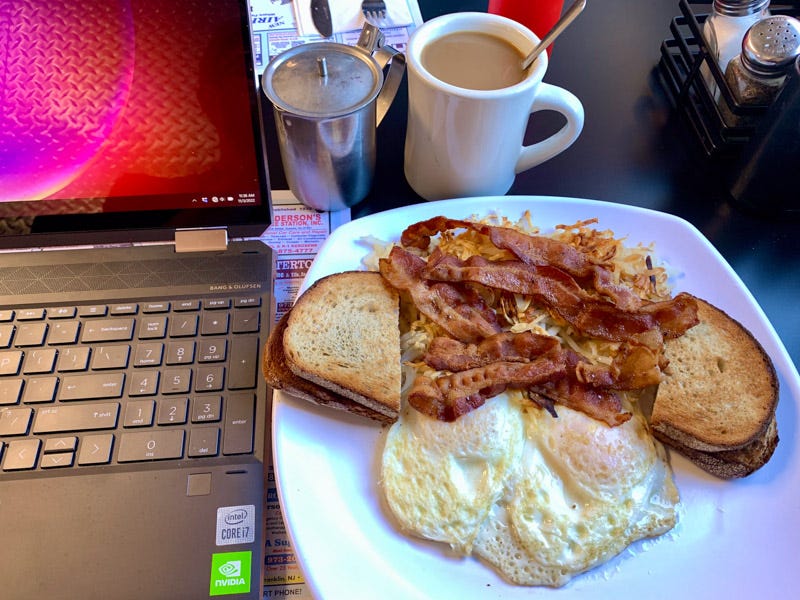 The woman with the jangly keys was on her way home. As she passed behind me, the man waiting for his eggs turned and saw her. The two recognized each other and exchanged friendly hellos with more than just the throwaway, passing politeness of recognition. I took their relationship to be one of a longtime server and well known regular. That was more or less confirmed when she stopped to talk for a minute.