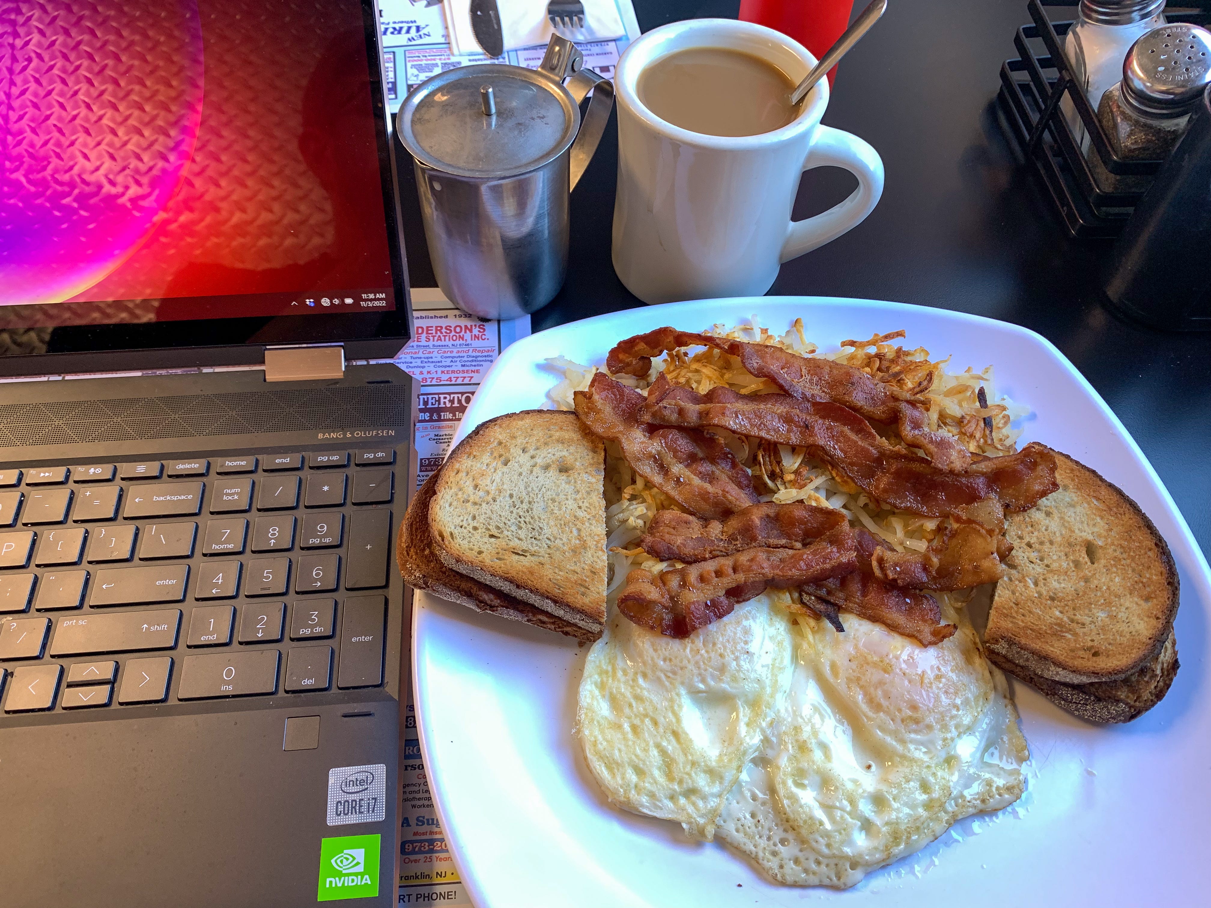 The special: eggs, bacon, hash browns and toast - $6.
