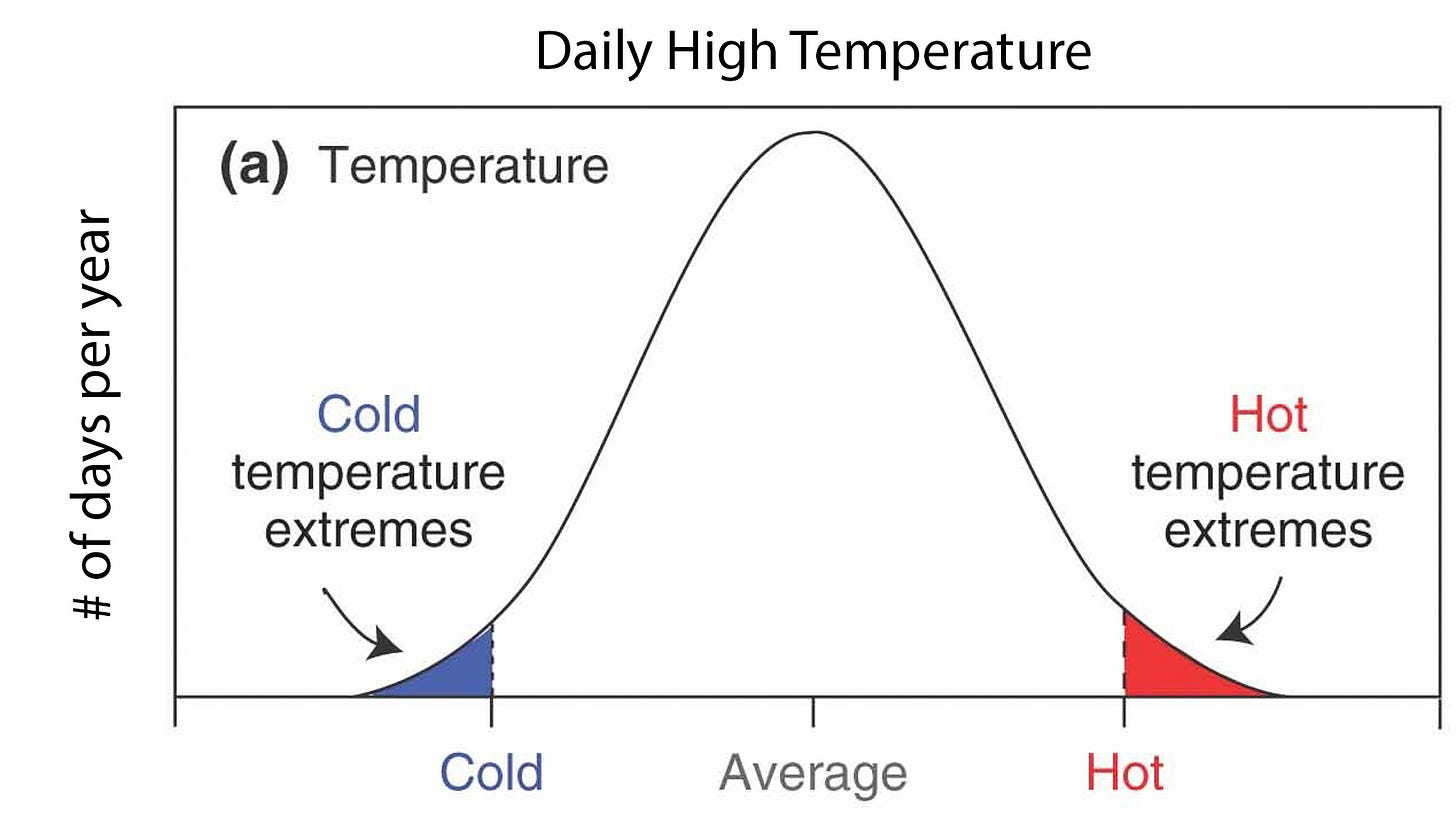 That bell curve is called a ‘normal distribution’. When it comes to weather, variation is normal and so is even significant or extreme variation. That is how weather works. And that is how humans work. We don’t come in one temperature… and with a lot of our qualities, we don’t even stay one temperature.
